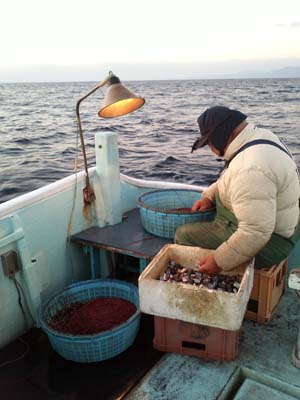 1人で15個ぐらいの網を所有していて、それを仲間の漁師さん達と網にかかったエビなどを取っていきます