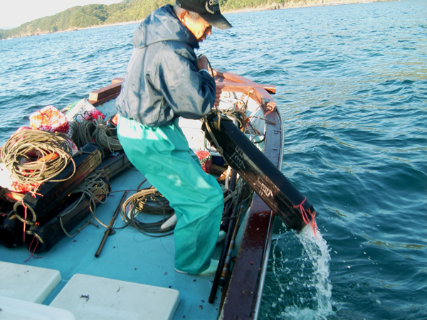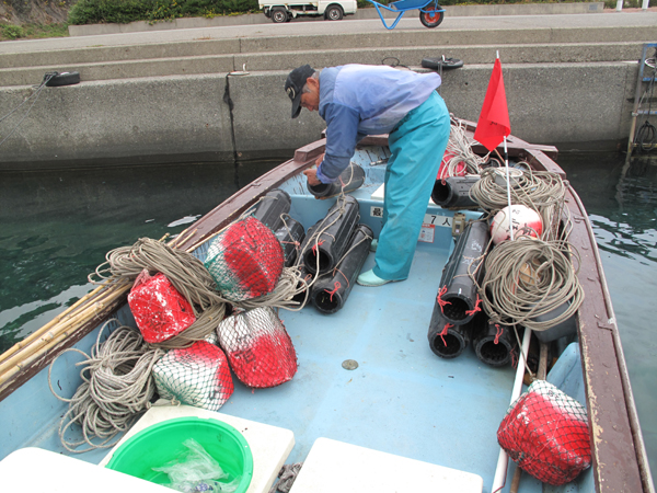 浮きをつけたウツボ籠を乗せて漁場へと出港します!