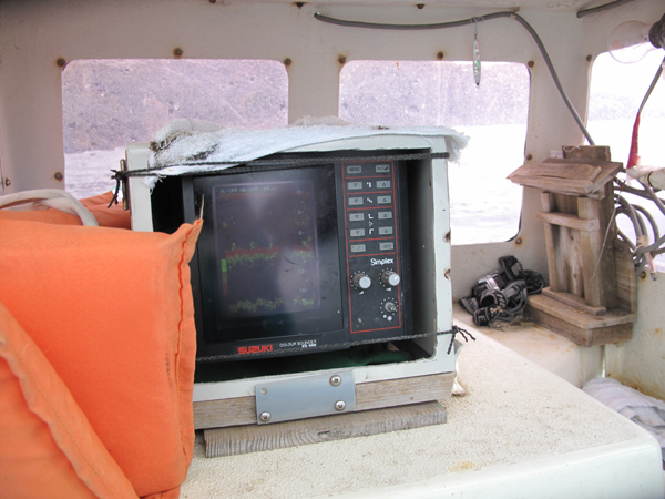 魚群探知機を見ながら、ウツボ籠を投げ入れる場所を決めます。
