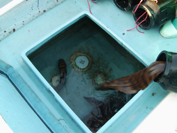 籠の中にはウツボの大好物のタコがエサとして入っています。