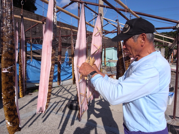 さっそく獲れたウツボを背開きにして、竹ざおに1枚ずつ広げて干します。