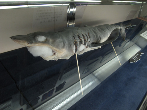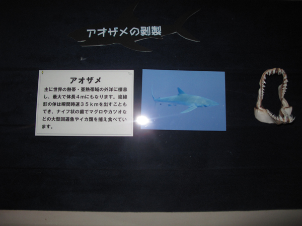 本物のサメのアゴやアオザメの剥製(ちなみにうちな~さんの力作です