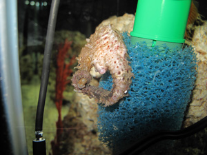 笑本来、タツノオトシゴの仲間は波に流されないように海藻やヤギ類に尾を巻き付けて体を固定するんですが、これじゃ・・・・・・
