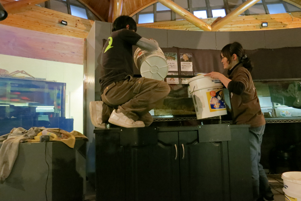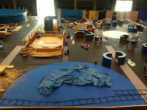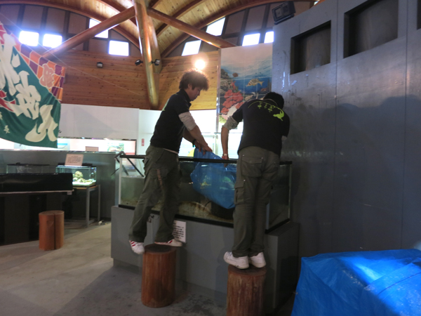 クジラの搬入を見届けると、急ピッチで水族館を仕上げていきます