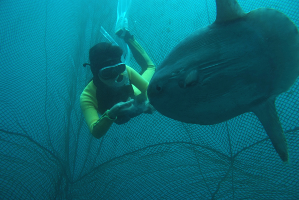 そこで、毎日スタッフが素潜りでマンボウの口元まで潜り、