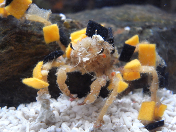 モクズショイはタカアシガニと同じクモガニの仲間で甲羅や脚に生えている鍵状に曲がった毛に
