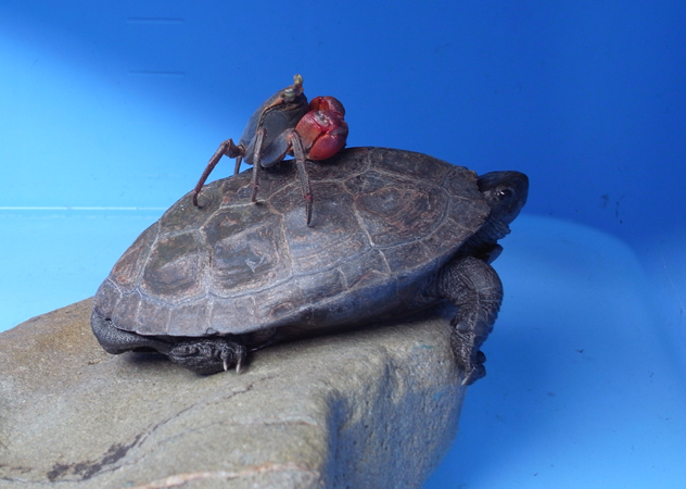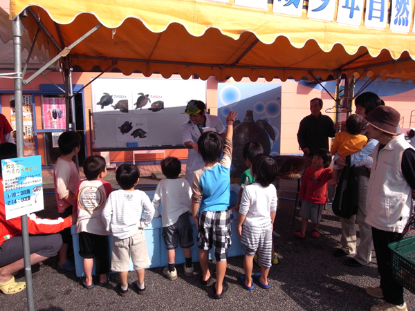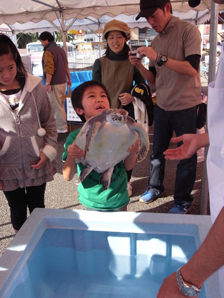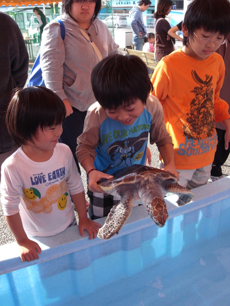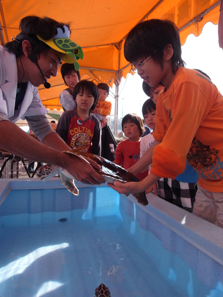今回は水族館から3歳アオウミガメのハナビとコムギが出張しました。