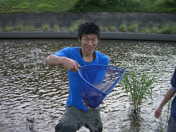 タモを構え、逃げてきたエビやカニ、サカナを捕まえます!