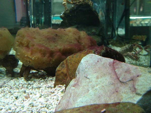 海ではカイメンと言う生き物を脚に引っ掛けて背負っていますが、漁師さんの水族館で展示中のオオカイカムリはカイメンではなくウミウチワなどを背負っています・・・。