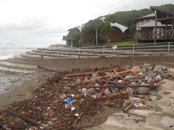 残った小さな浜には巨大な木と大量の岩と木片がたまっていました