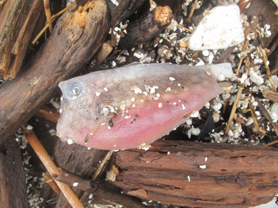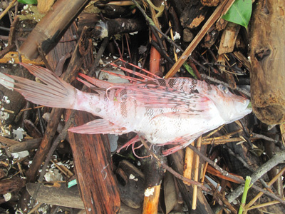 残骸の間を見て周ると波に負けてしまった魚達の姿もありました