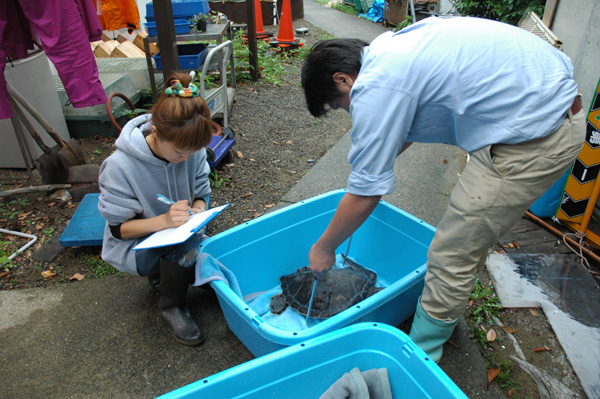 海へ帰す前には保護されたウミガメの体長・体重・特徴などを