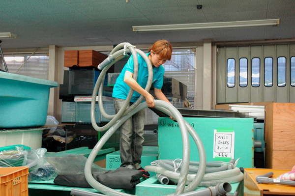活性炭(ろ過材)を入れているところ。
